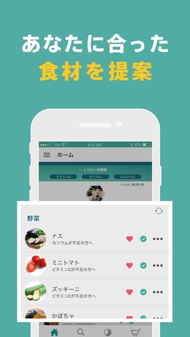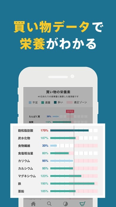 面倒な食事管理は一切不要!ポイントカードを登録するだけで、毎日の買い物データから栄養状態を診断。仕事や育児で忙しいアナタも、料理好きのアナタも、食べたいものを食べて健康を目指せる“がんばらない”ヘルスケアアプリです。