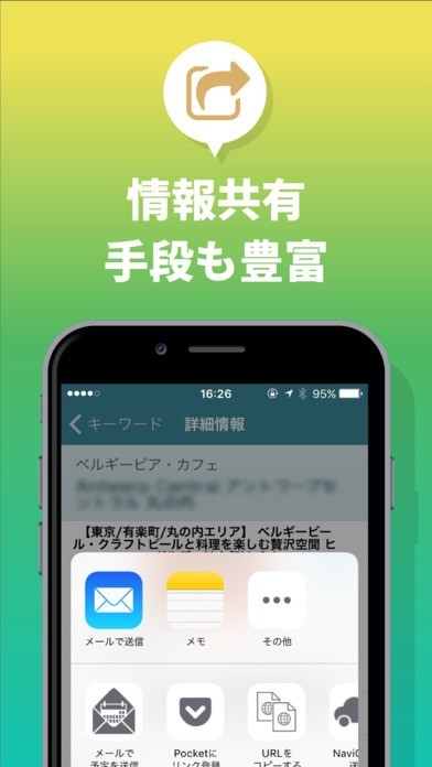 メールで送信の機能が使えて情報を共有して友人と一緒に遊びに行くのに利用出来る