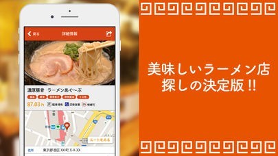 美味しいラーメンが食べたい!せっかくだから人気のラーメン店に行ってみたい! そんな時に嬉しいのがこちらの「ラーメンチェッカー」です。 GPSを利用し、現在位置から近隣のラーメン店を検索。地図を表示しながらラーメン店の場所をアイコンで案内してくれます。 好みのお店や行ってみたいお店を見つけたら、マップのアイコンをタップしてみましょう。 写真や詳細説明とともにお店までの経路も表示してくれるので、あらかじめ住所や地図などを用意していなくてもすぐに辿り着くことができちゃいます!