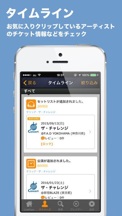 このアプリを使えば、スマートフォンの中にあるたくさんの曲の中から「セットリスト」を登録することができ、曲をつながりで長時間聴きたい人に向いていたり、「エフェクト」によって、ライブのような臨場感あふれる音へと変えてくれるので、いつもとは違った感覚で楽しむことができます。 この機能を使うことによって、自宅にいながらもいろいろな場所で曲を聴く疑似体験をできます。 他にも「タイムライン」によって、お気に入りのアーティストのチケット情報などを知れたりもするので、情報収集の場としても利用することができます。 他にも自分が参加したライブを記録しておけるので、あとからそれを見て話のネタとして活用したりすることができたり、感想をレビューできるので、それを見ることによって、行ってみて失敗だったというような最悪の事態を避けることもできます。 これらは有料版などはなく、すべて無料で使うことができます。