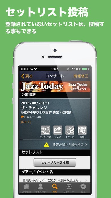 ライブの感想投稿が行えます。感想投稿をして、ファン同士で盛り上がってみてはいかがでしょうか。また、レビュー投稿も可能となっており、他ユーザーにライブレビューを読んで貰うことができます。