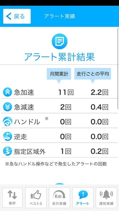 安全運転支援アラート機能によって、車の運転中に急加速や急減速などを行った場合にはアプリが感知してアラートで警告をしてくれるので、安全運転を心がけることができます。