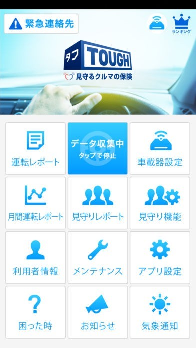 「タフ・見守るクルマの保険」は、あいおいニッセイ同和損保が提供している同名の保険専用のアプリになります。安全運転支援アラート機能によって急加速や急減速などを感知した場合にはアラートでお知らせをして安全運転を促してくれるようになっているほか、事故緊急自動通報サポート機能でオペレータから安否確認をしてもらうことができます。
