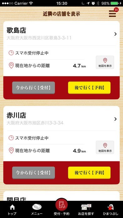 日時指定で予約だけでなく、スシローのように「今から行く」という予約ができるアプリはあまりありません。特に基本108円の回転寿司はなんとなく今から行こうという気分になることが多いので、利用しやすいです。