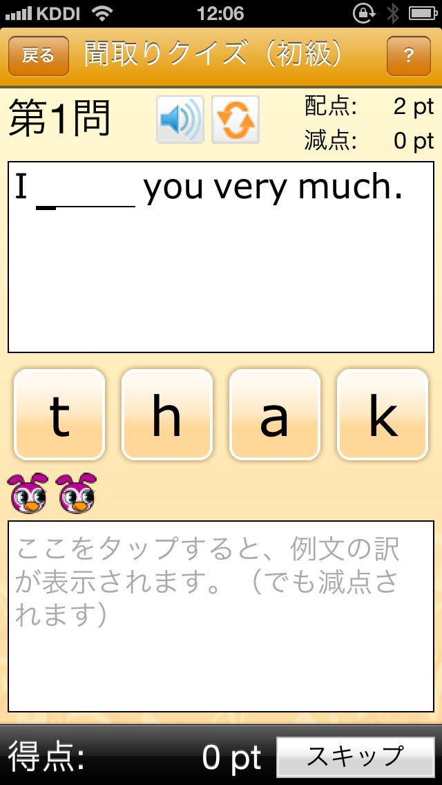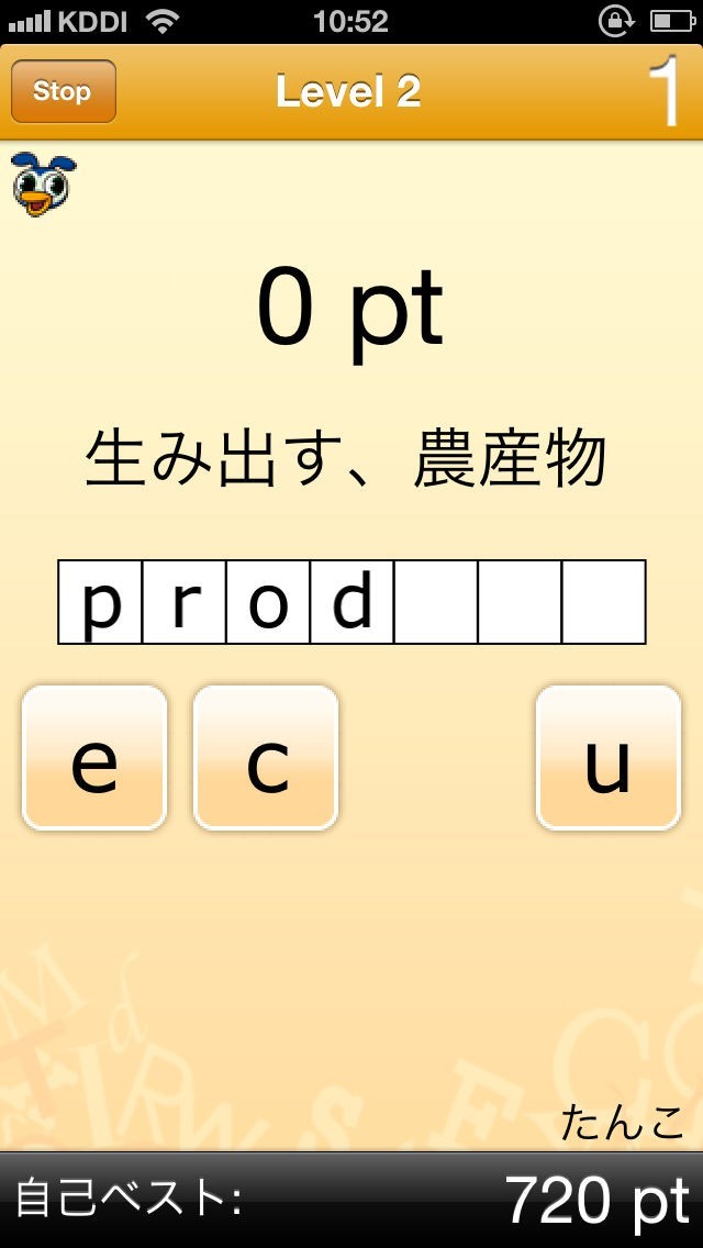 やり方は簡単。単語の意味を見て、該当する単語が正しいスペリングになるようにアルファベットを順番にタッチするだけ。