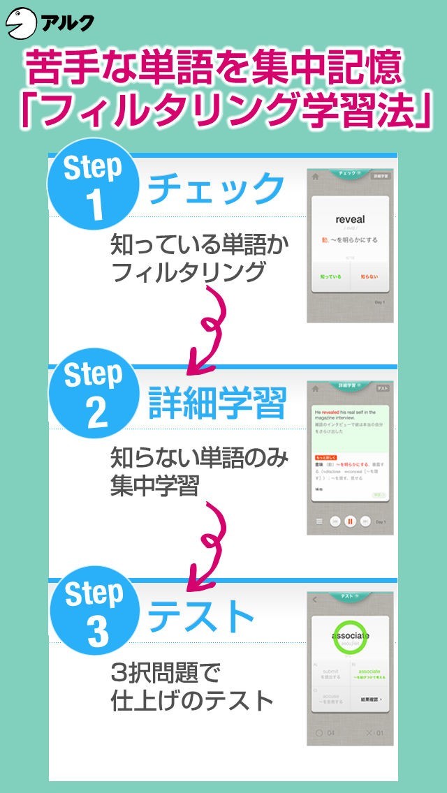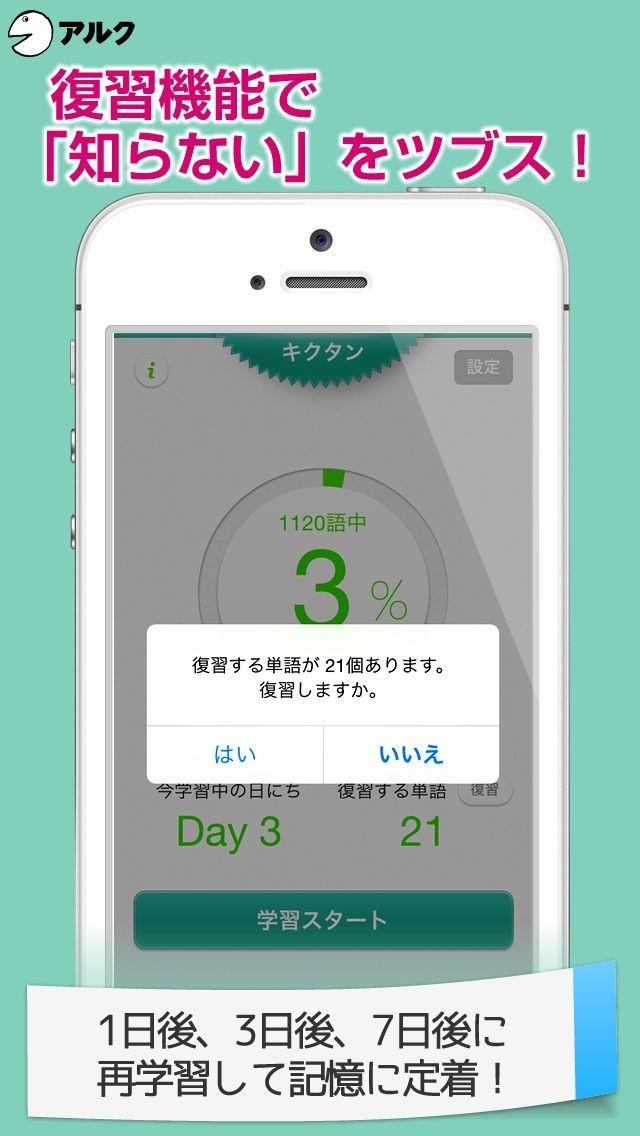 どんなに頑張って英単語を覚えたとしても日にちが経過するとだんだんと記憶は薄れてしまうものです。そこで、学んだ次の日、三日後、一週間後の3回に分けて効率的な復習が可能です。