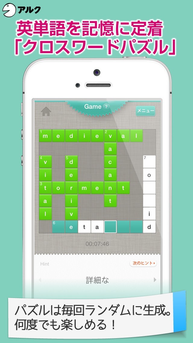 自動で作り出されるクロスワードパズルを使って単語学習を行えます。適度にヒントが提示されることによって、覚えた単語を思い出すためのきっかけを作ることができるのです。