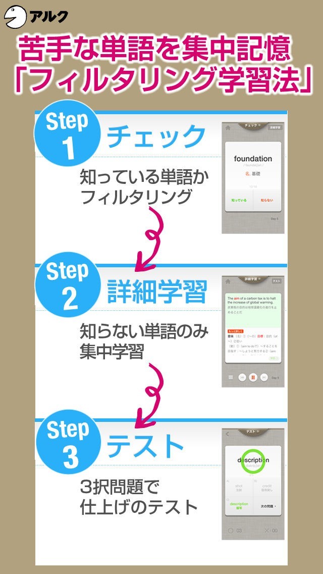 アプリ内では三択の問題形式でTOEICで出題されやすい単語をマスターできます。すでに知っている単語は出題範囲から省くことができるのでわからない単語だけを効率的に学べます。