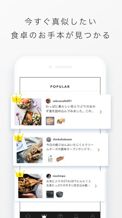 TABLESには最新の投稿が表示される「タイムライン」や人気の投稿が見れる「ランキング」機能があり、いつでも素敵な食卓の写真を見ることができます。