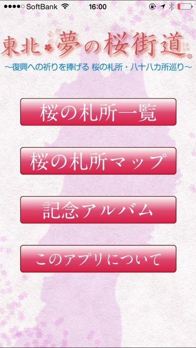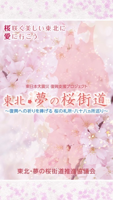 東北・夢の桜街道は東日本大震災復興支援プロジェクトとして、東北支援のシンボルに桜の札所・八十八ヶ所が選定されました。 「東北桜街道」は、東北6県八十八ヶ所の桜をチェックする事ができるアプリです。 アプリでは、美しいシダレザクラや見事な桜並木、どこか懐かしさを感じさせる桜などを写真で見る事ができます。 桜の札所は、一覧やマップからカンタンに検索する事ができます。 桜の写真とともに桜の種類や樹齢まで載っているので、図鑑のようにして楽しむ事もできます。
