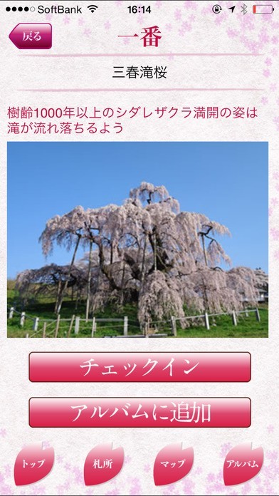 訪れた札所はチェックイン機能で記録。撮った桜もアルバムにまとめていつでも見られる!