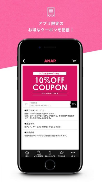 ANAPの買い物ができたり旬のコーディネートが見れるだけではなく、限定クーポンが配信されてお得です。
