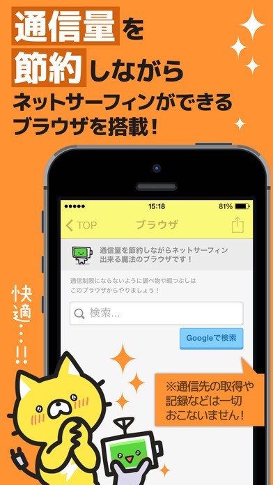 今月はあとどれぐらいの通信量が残っているのか気になる、ゲームのやりすぎで通信量が心配。『STOP通信制限!』はそんな悩みを持つ方に嬉しい機能を持った通信量測定アプリです。メインとなる通信量チェッカーは、アプリを開くだけで測定を行い、現在の利用パーセンテージや利用期間などを表示してくれます。トップ画面からはタップするだけで「あとどのぐらい?」画面へと遷移可能。ネットサーフィンや動画再生、メッセージ送信を行った場合にそれぞれ何回ぐらい実行できるのかの目安を教えてくれるため、残り通信量を利用する際の参考になるでしょう。また、通信量を制限したブラウザ機能では、検索フォームから手入力でフリーワードを入力し、Google検索を行うこともできます。