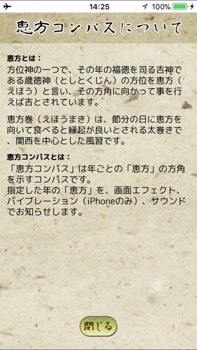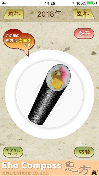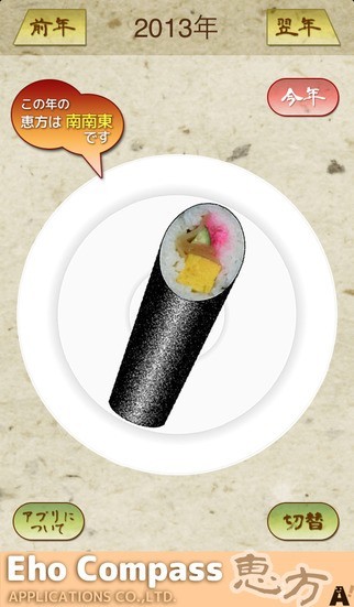 このアプリを使えばその年の恵方を知ることができるので、いざ恵方巻きを食べようという時にどこを向いたらいいのか解らずに食べられないというようなことが無くなります。 よって、恵方巻きを食べるすべての方の役に立ちます。 3Dの恵方巻きによって方角をしめしてくれるので、その通りの向きで食べることで、目標を達成することができます。 それ以外にもヴァイブレーションによっても方角を知らえてくれるので、スマートフォンを見ている余裕が無い、もう両手が塞がっているというような場合に役立ちます。