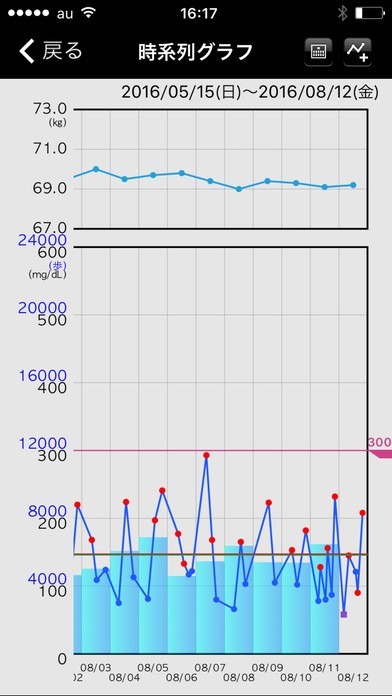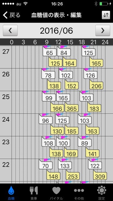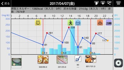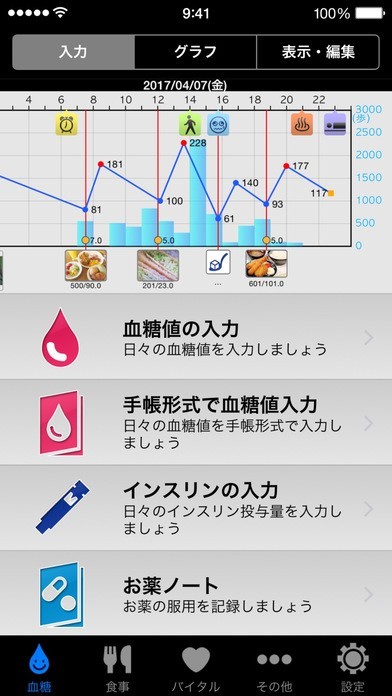血糖値入力機能で日々変化する数値も楽々管理!グラフ表示で変化も判りやすい!