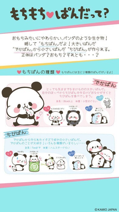 おもちみたいにやわらかい、パンダのような生き物。 大きいぱんだ「でかぱん」から、小さいぱんだ「ちびぱん」がつくられる。 いつももちもち、みんなでくっついているよ。 正体は、パンダ、おもち、それとも・・・