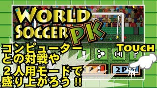 簡単操作でプレイできるサッカーPKゲーム「WORLD SOCCER PK」 画面に表示されるボールをフリックで操作してショートを決めましょう。 ドライブ、右カーブ、ナックルなど5種類のシュートを選択可能。 キーパーの動きを読んでシュートを選択することが、試合を勝ち抜くための近道となっています。 CPUと手軽に対戦できる1Pモードに加えて、友達と遊べる2Pモードも搭載。 放課後の空き時間や移動中の暇つぶしに、友達とワイワイ盛り上がってみてはいかがでしょうか。