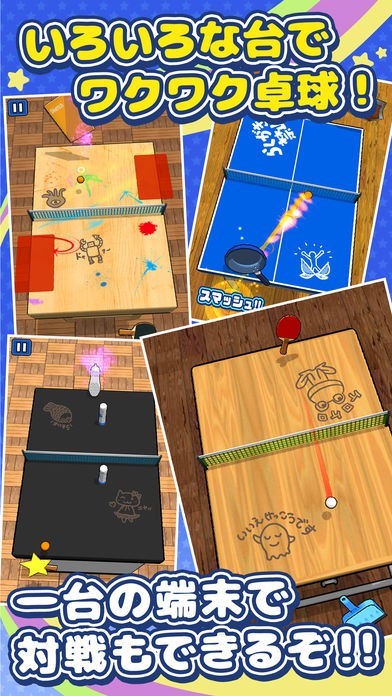 「机で卓球」は学生時代に教室で遊んだように勉強机で卓球をするちょっと変わったスポーツゲームです。違うのは卓球台だけではなくラケットもそうでノートや黒板消し、スリッパやおなべのふたなどいろいろなアイテムをラケット代わりにして卓球小具を行います。ユニークなルールながら卓球ゲームとしては本格的で左右のフットワークや前後の揺さぶり、緩急をつけたレシーブなど操作次第で多彩なショットを打ち分けられます。いろいろなラケットの使い手を勝ち抜くプレイモード、一台の端末でも楽しめる対戦モード、設定された課題をクリアしていくチャレンジモード、全国のライバルと戦える通信対戦モードなどたくさんのモードが用意されています。1試合5分程度で終わるので休み時間でも楽しめますが対戦モードは試合が白熱すると20分程度かかることも。勝負に勝つコツはスピードボールだけに頼らないことで、左右へ打ち分けて揺さぶったりスローボールでタイミングをずらしたりと気持ちよくレシーブさせないようにすると相手のミスを引き出してポイントを稼げます。チャレンジモードで正確なショットを磨くと打ち分けが上手になります。