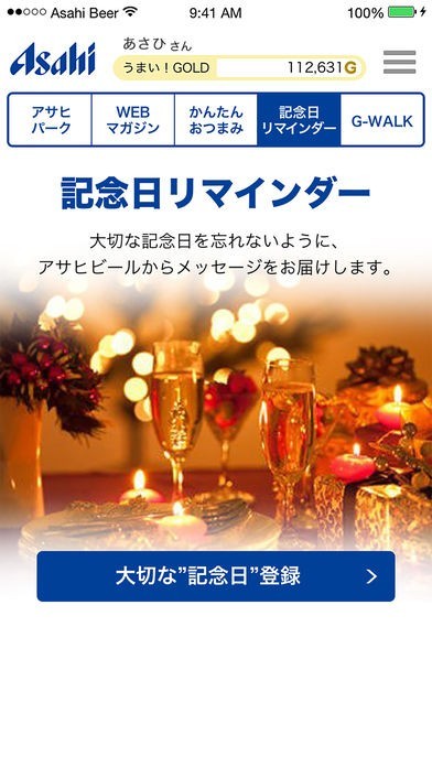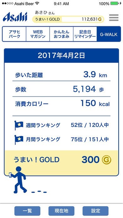アサヒビールアプリでは身長体重を入力すると万歩計機能と連動して消費カロリーを算出してプレゼント応募に使えるポイントが貯められます。なお、ポイントは記事を購読することでも貯められます。