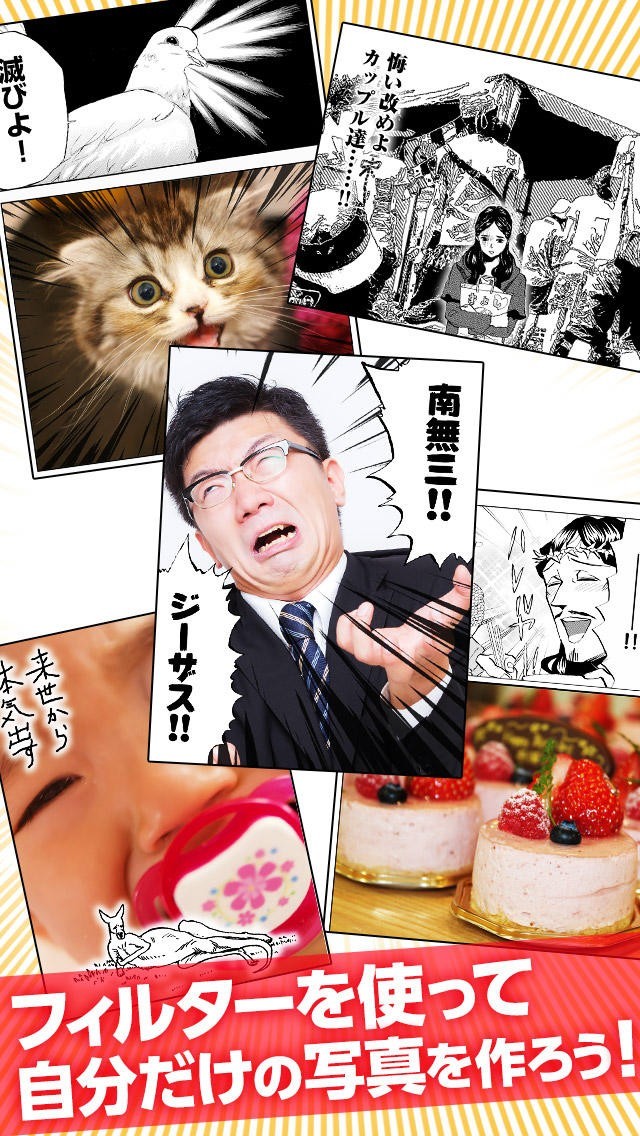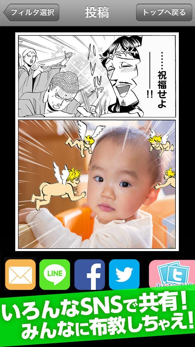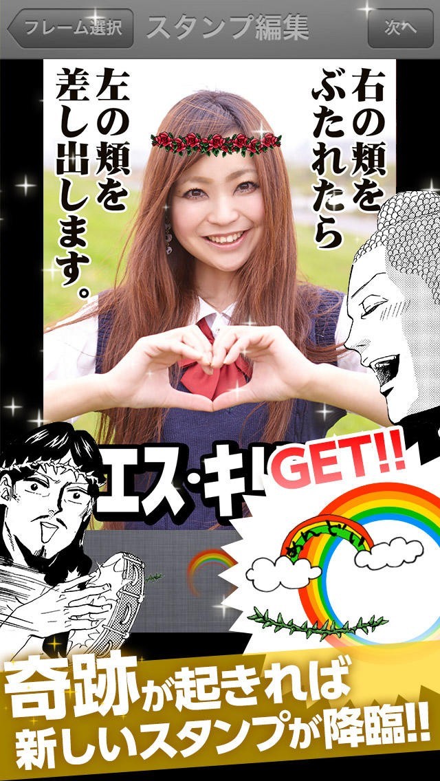 カメラを起動して写真をとってスタンプを押したり、聖おにいさんオリジナルフィルターを選べば誰でも簡単に楽しめる!