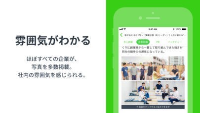 興味を持っている企業を「気になる」に登録出来るようになっています。また担当者の方と手軽にマッチングする事が可能で、社内の雰囲気を写真で把握出来るのも特徴でしょう。