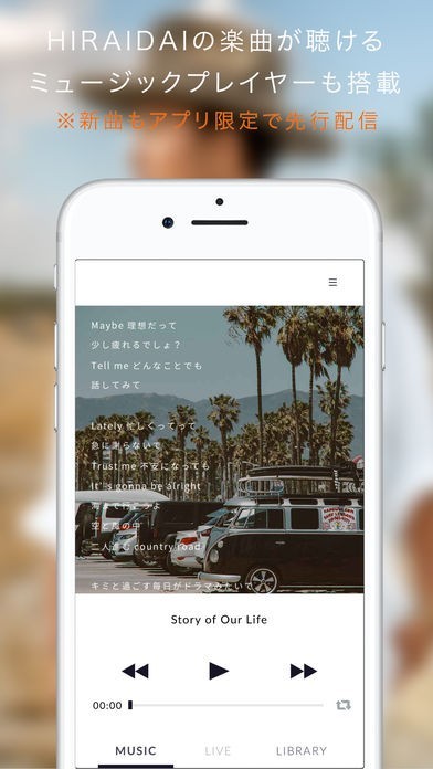 HIRAIDAI氏の楽曲を歌詞を見ながら楽しむことができるミュージックプレイヤーも搭載しているので、HIRAIDAI氏のファンの人なら必見のアプリとなっています。
