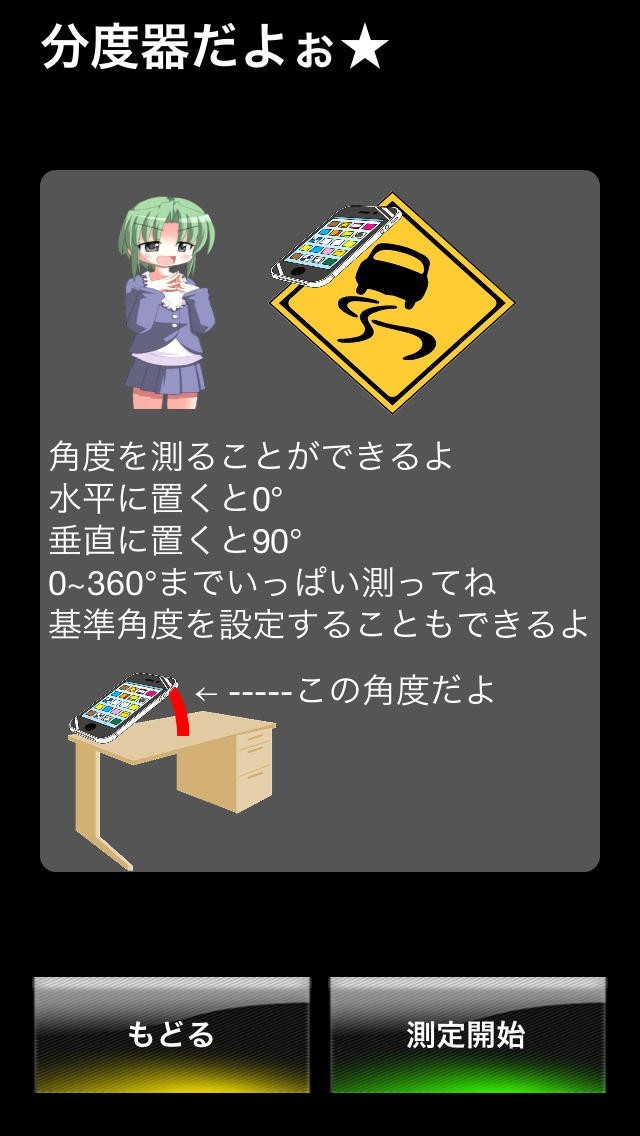 iPhoneを水平において0°、垂直において90°、0~360°ぐるっと測定できます。