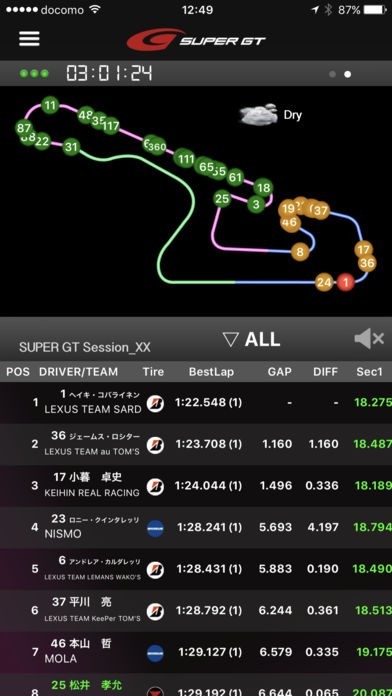 外出先でもスーパーGTのレース状況をリアルタイムに確認できるのが便利です。