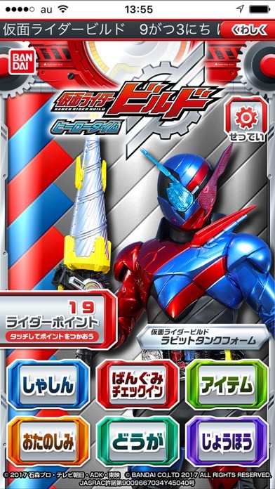 App Storeより引用テレビ朝日系 毎週日曜日 朝8:00から放送のTV番組「仮面ライダービルド」を応援する、ファミリーで楽しめるアプリです。