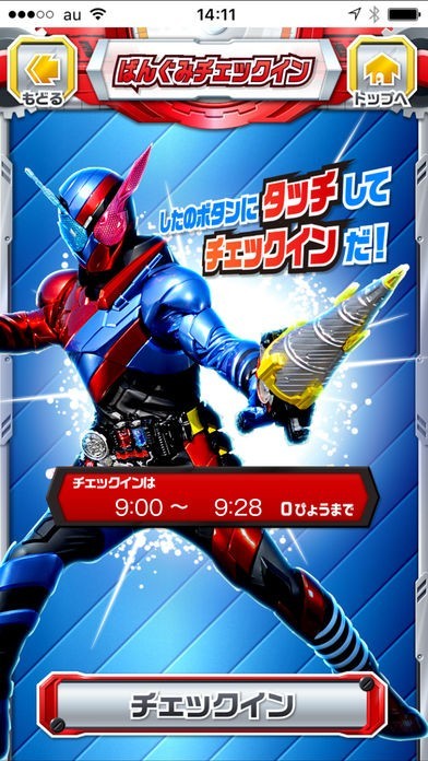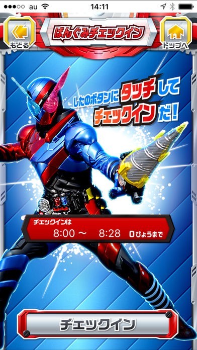 …TV番組「仮面ライダービルド」をリアルタイムで見ながらアプリを起動すると、「ばんぐみチェックイン」が可能になります。番組に「ばんぐみチェックイン」すると、番組放送終了後に「しゃしんフレーム」が毎週プレゼントされます。(「ばんぐみチェックイン」は8:00~8:28のみ可能。一部の放送地域では本サービスは提供されません。)