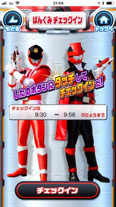 テレビ番組「快盗戦隊ルパンレンジャー VS 警察戦隊パトレンジャー」をリアルタイムで見ながらアプリを起動すると、「ばんぐみチェックイン」が可能になります。