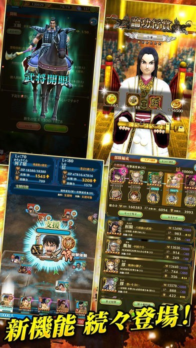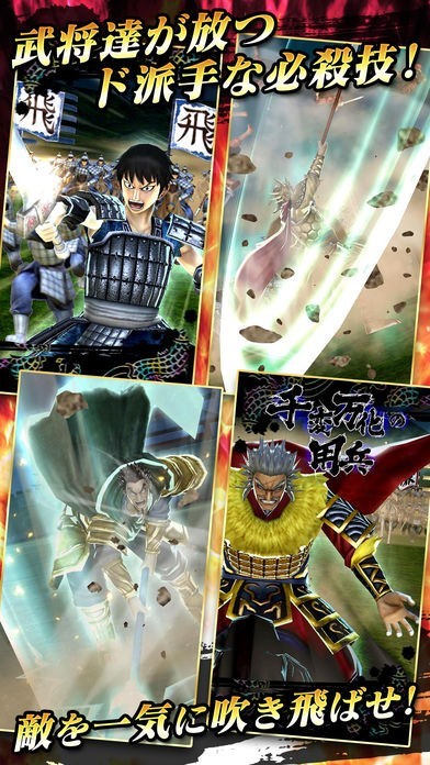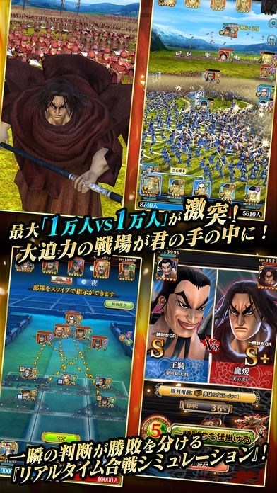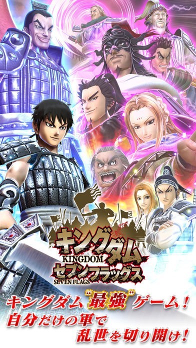 アプリ「キングダム セブンフラッグス」では、中国史をモチーフにした超有名少年マンガ「キングダム」のキャラクターたちが次々に登場し、合戦方式で戦うバトルゲームをで遊べます。スケールの大きい原作の世界観どおり最大で10,000人もの軍勢を戦わせることができるようになっていて、フィールドいっぱいに展開する自軍を率いて戦えます。
