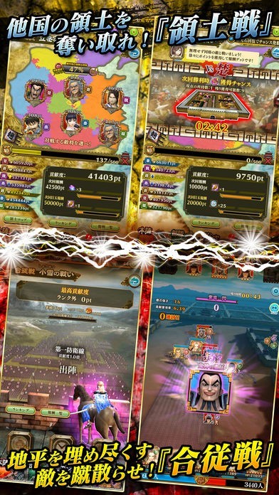 ゲーム内では月に2回、作中に登場する7つの国に分かれてポイントを競い合う「領土戦」が開催されます。同じ国に所属するプレイヤーと協力して戦えば、乱世の頂点に君臨する楽しさを味わえます。