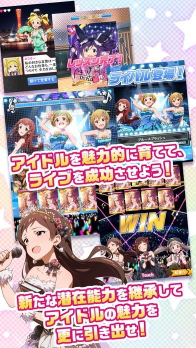 アイドルマスターシリーズのひとつで、「劇場」を拠点に、プロデューサーとして全50人のアイドルたちを育成していくゲーム。新カードの追加やイベントの開催が月に数回行われるので、自分の担当アイドルの新しい魅力を発見していくことが出来ます。育成も単なるカードのレベルアップだけでなく、アイドル個別の潜在スキルやデッキで発動する連携スキルなど、強化していく方法は様々。自分だけのこだわりカードを揃えて、全国からどんどん担当アイドルのファンを獲得していきましょう!