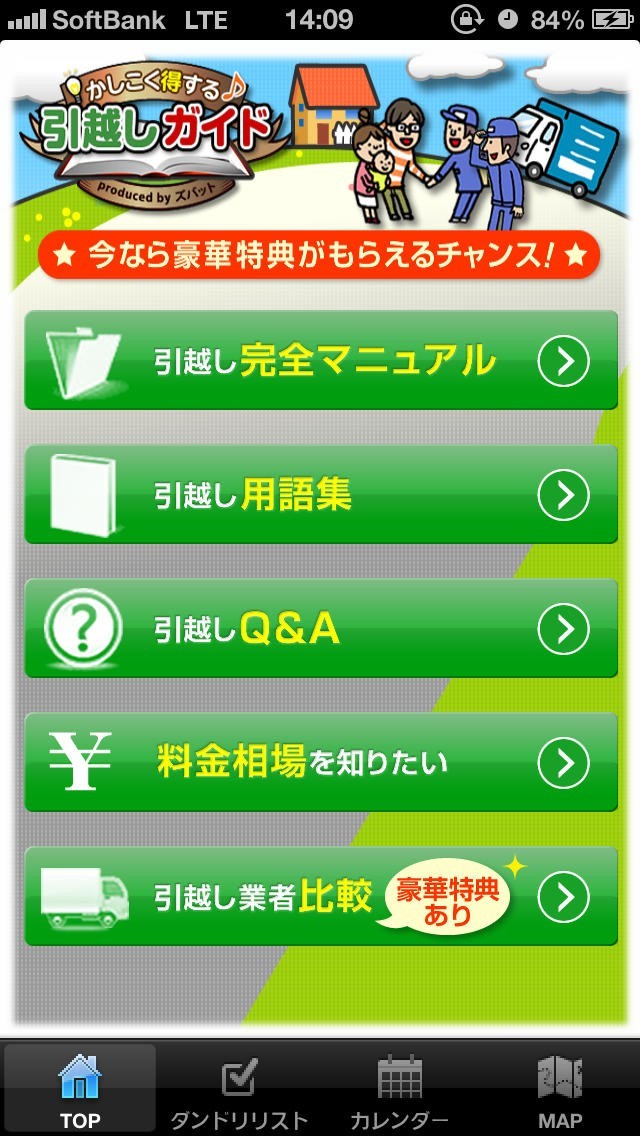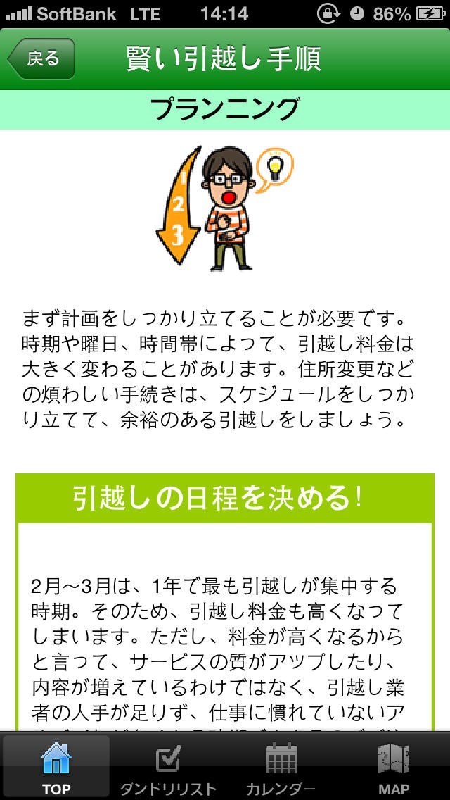 引越しをしたいのだけれどどうすればいいのかが分からない時やどの時期に引越しをすると金銭的に得なのかを調べたい時にオススメしたい『かしこく得する引越しガイド』は引越しをするガイドだけでなく200以上の業者から見積もりをまとめて比較することができるアプリになっています。 引越しの予定日を「引越しカレンダー」に登録するだけで逆算して予定日までにしておく事をアプリのカレンダーにリスト化してくれるのでどのように引越準備を進めていけばいいのかを教えてくれます。 また、引越先の情報が「引越しMAP」で病院や郵便局などの周辺の施設の場所がわかる機能も用意されています。