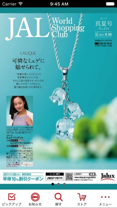 JAL機内誌であるJALSHOPにおいて販売されている通販商品をピックアップして紹介してもらうことができます。さらにはマイルキャンペーンやセールの情報も配信してもらうことがてきます。ローテーションバナー機能があり、これはアプリ限定のキャンペーンなどを知らせてもらうことができます。メニューで細かく選ぶことができます。トラベルからグルメ、そして何よりJALオリジナルのグッズも選ぶことができます。さらにはメンズ、レディースファッションもありますし、ライフスタイルというカテゴリーから選ぶことが可能です。カテゴリー別に商品を検索できるので効率的に見つけることができるのです。
