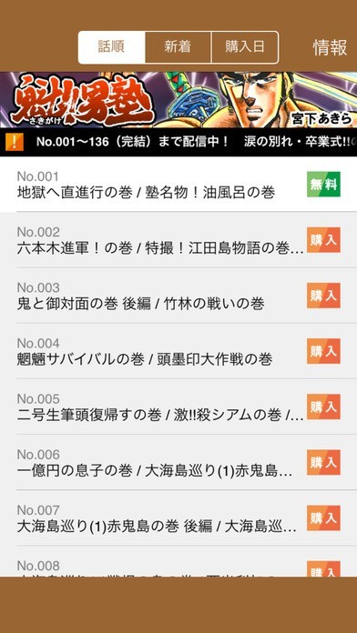 かつて週刊少年ジャンプに連載され、熱い男の戦いを描いて人気を博したコミックがオリジナルとして登場! 「魁!!男塾 オリジナル版」では、連載中に作品ファンだったという方に改めて楽しめる魅力に溢れたアプリです。 ビューアで開くと、ページではなくコマ単位で展開。描き込まれたコマを1コマずつじっくりと読めるのが、このアプリならではの特徴でしょう。 画面に表示されたコマはタップで進行し、臨場感たっぷりの展開を満喫できるようになっています!