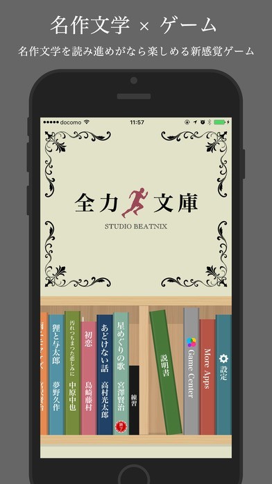 「全力文学 - 名作文学を全力疾走!」は、青空文庫などに登録される昭和の名作文学作品に「全力」で触れ合う動体視力系のゲームです。宮沢賢治や太宰治といった文豪の作品からの抜粋が、画面上を流れるように表御師され、その中に含まれる漢字をタップしていくというゲーム内容。文学はかなり高速で流れていくため、スタイリッシュな印象を受けるゲームです。見た目がオシャレでかつハイカルチャーな雰囲気の伴う内容なので、仕事中の休憩時間などに遊ぶのにも向いていると思われます。収録作品には、芥川龍之介や坂口安吾、森鴎外といった有名作家のものも多く、全ての漢字をタップし「読了」のマークをつける頃には何となく有名作品への造形が深くなっているかもしれません。