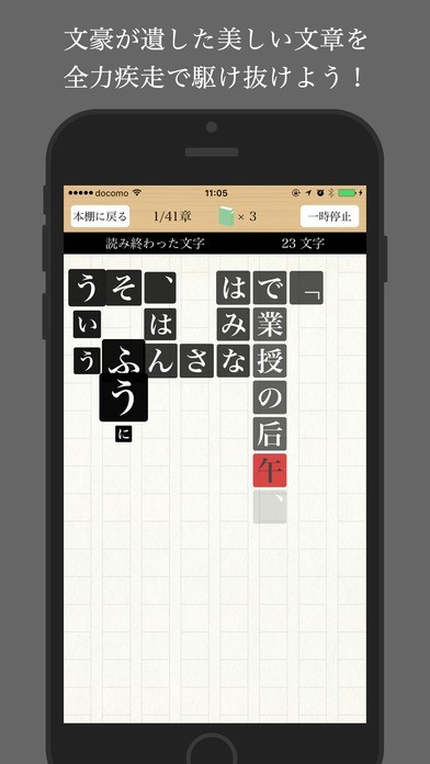 時間経過に合わせて文字が消える!小説内の漢字だけをタップしていくカジュアルゲーム