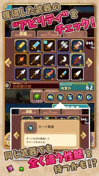 武器には「火」「水」「木」といった属性や「毒」「麻痺」などの特殊効果があるぞ。