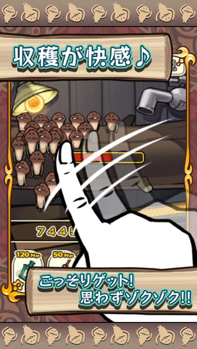 栽培ルームに生えたなめこを指先スワイプで一気に収穫!爽快感にハマること間違いなし!