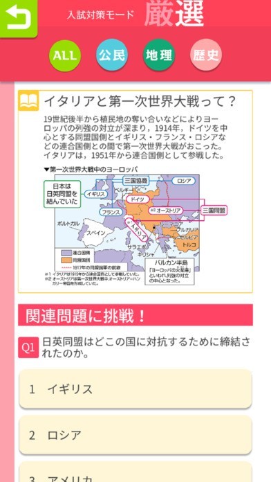 「入試対策モード」は、関連する学習事項(公民・地理・歴史)でフィルタリングできる!