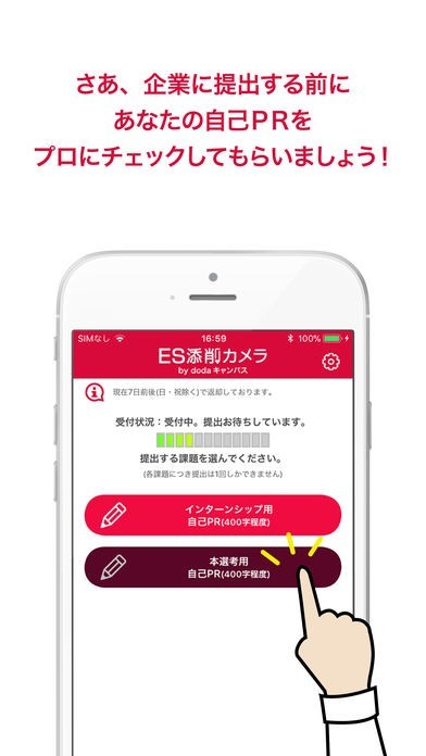 就職活動で企業に提出するエントリーシートをプロの視点で添削してもらうことが出来るアプリが「ES添削カメラ by DODA新卒エージェント」です。自分のエントリーシートをスマートフォンのカメラで撮影することで、就職のプロであるDODAのエージェントに提出することができるようになっていて、7日前後で添削結果が返ってくるようになっています。どこをどのように変えたらいいのかなどを具体的にアドバイスしてくれるので自信をもって就職活動に挑むことが出来ます。