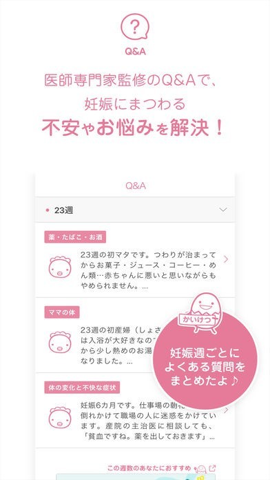 初めての妊娠・出産・育児を体験するママ・パパに向けてそれぞれのお悩みに役立つ安心情報をお届けするアプリです。妊娠中はおなかの赤ちゃんの成長を妊娠日数によってお知らせし、妊婦の体調・体系の変化や食事・体操・運動・マタニティウェアなど妊婦さんのお悩みを解消できる情報が届きます。パパにもお役立ちの情報を提供。同じ月齢のママとのコミュニティサイトもあります。出産時のQ&Aも便利です。産後、育児中は赤ちゃんの発育や病気、予防接種や健診の注意点、赤ちゃんの月齢に合わせた遊び方など様々なアドバイスが受けられ、妊娠主産本のようなお役立ち情報を得られる便利なアプリです。