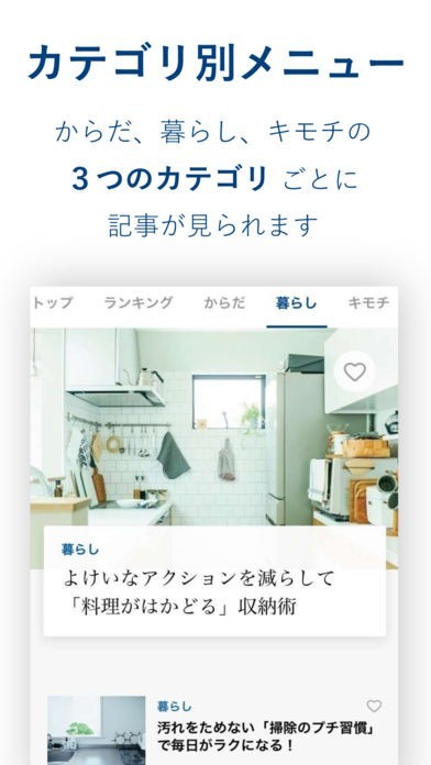 コラムは大まかに、「暮らし」「からだ」「キモチ」の3タイプにカテゴリー分類されているので、自分の気になっている情報だけを素早く見つけて情報を取り込めるように工夫されています。