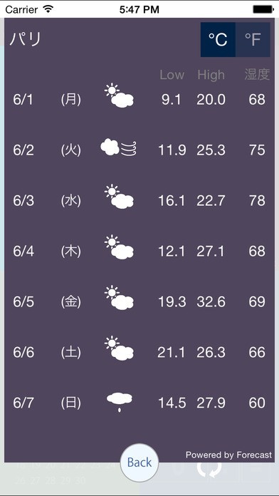 ・旅行先のお天気が今日を含めて5日先までわかります