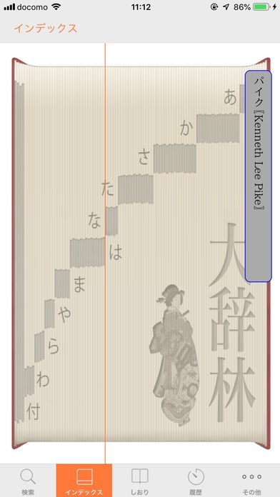 このアプリでは、「インデックスサーチ」を使って紙の辞書をパラパラとめくるような感覚で言葉を調べることができるので、普段紙の辞書を使っている人でも簡単に操作することができます。