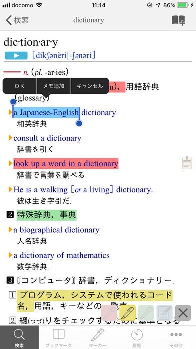 辞典が多数収録されており、項目ごとにマーカー入力などでメモが可能です。