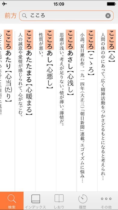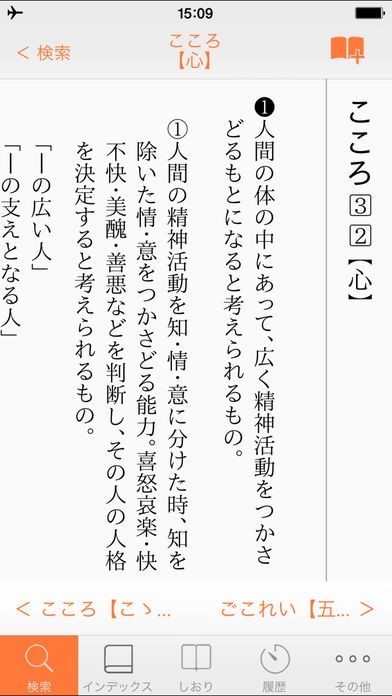 インデックス画面では見出し語を一覧することができるので、紙の辞書のような感覚で言葉を探すことができます。探している言葉以外の言葉とも出会えるので、日本語の知識をより深められます。