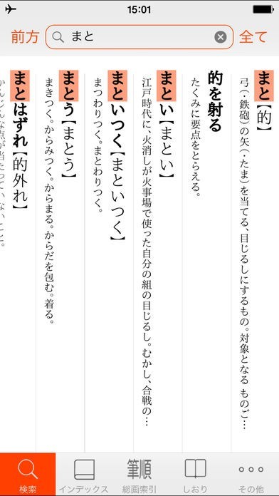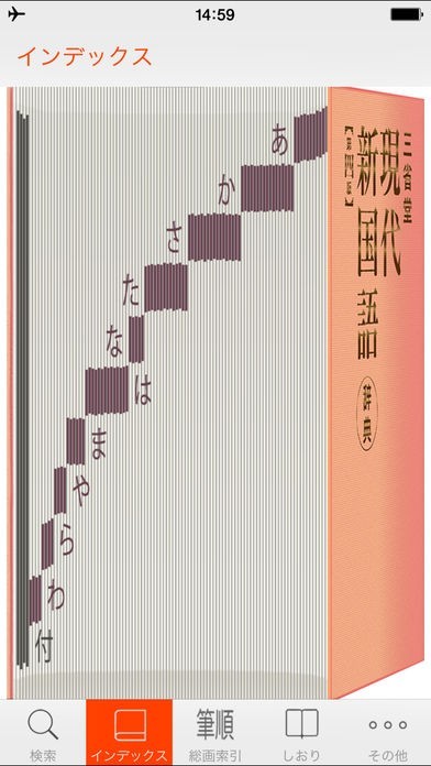 新たな言葉と出会いたい場合は、タブの「インデックス」をタップしましょう。紙の辞書の側面のような画面からページをぱらぱらとめくることで新たな言葉と出会え、また、スマホの入力に不慣れな方でも検索を行うことができます。